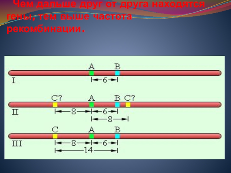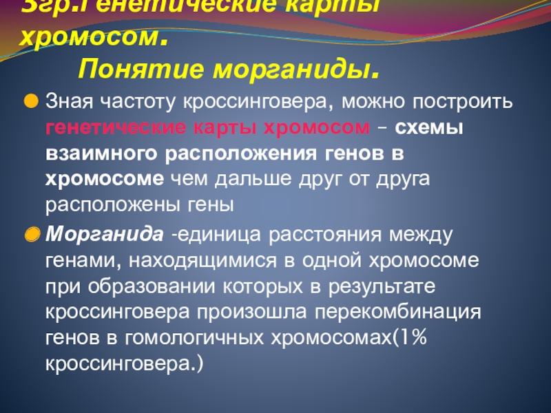 Зная частоту кроссинговера, можно построить генетические карты хромосом – схемы взаимного расположения генов в хромосоме чем дальше друг от друга расположены гены