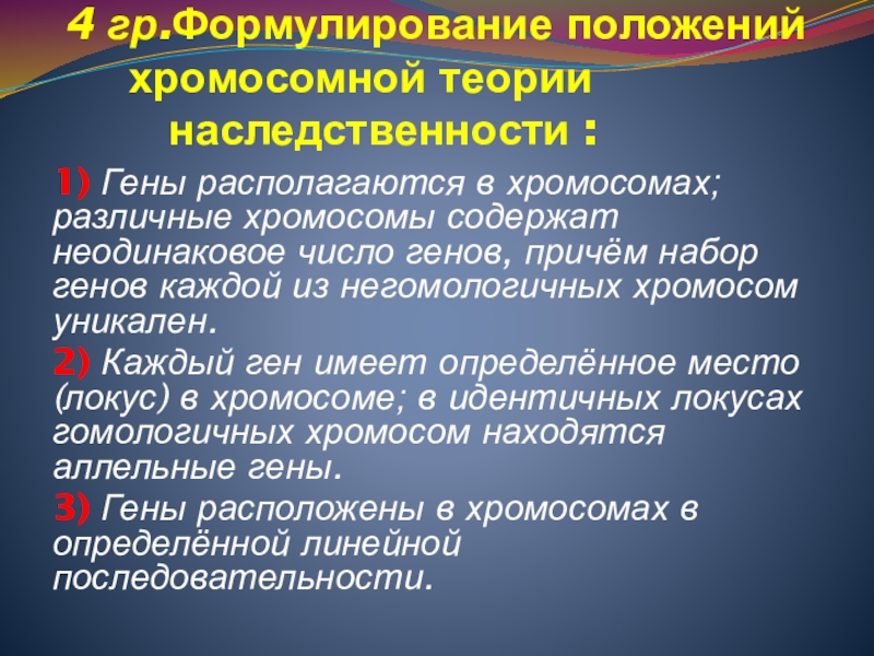 2) Каждый ген имеет определённое место (локус) в хромосоме; в идентичных локусах гомологичных хромосом находятся аллельные гены.