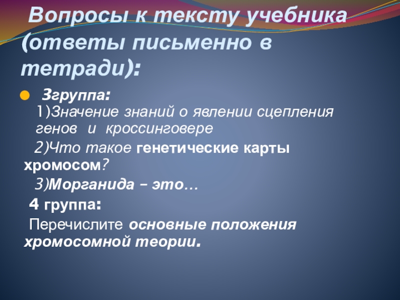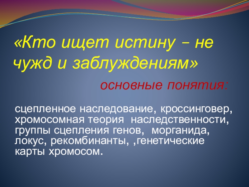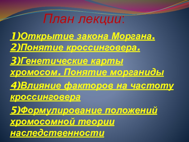 сцепленное наследование, кроссинговер, хромосомная теория наследственности, группы сцепления генов, морганида, локус, рекомбинанты, ,генетические карты хромосом.
