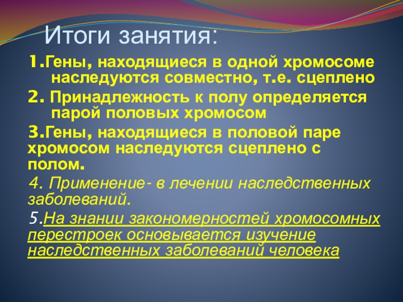 1) Гены располагаются в хромосомах; различные хромосомы содержат неодинаковое число генов, причём набор генов каждой из негомологичных хромосом уникален.