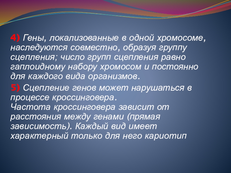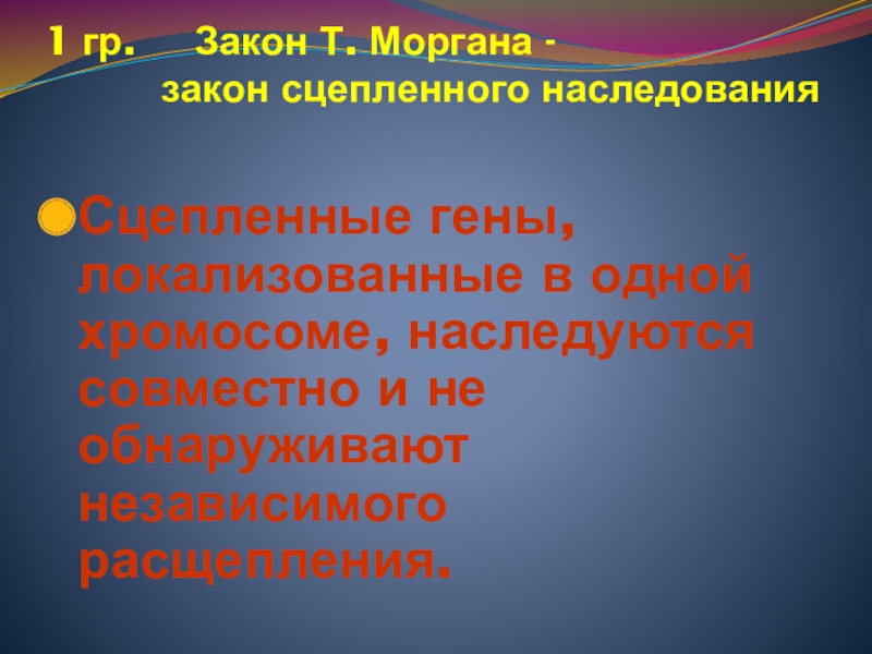 Сцепленные гены, локализованные в одной хромосоме, наследуются совместно и не обнаруживают независимого расщепления.