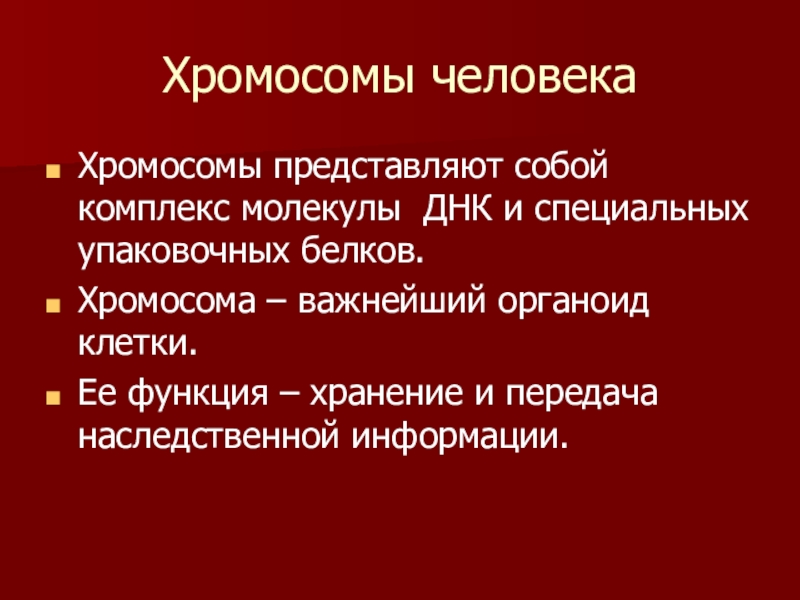 Хромосомы человекаХромосомы представляют собой комплекс молекулы ДНК и специальных упаковочных белков.Хромосома – важнейший органоид клетки. Ее функция – хранение и передача наследственной информации.
