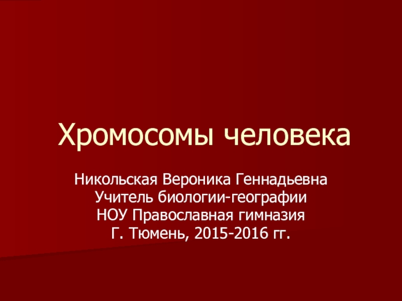 Хромосомы человекаНикольская Вероника ГеннадьевнаУчитель биологии-географииНОУ Православная гимназияГ. Тюмень, 2015-2016 гг.
