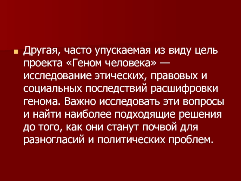 правовых и социальных последствий расшифровки генома. Важно исследовать эти вопросы и найти наиболее подходящие решения до того, как они станут почвой для разногласий и политических проблем.
