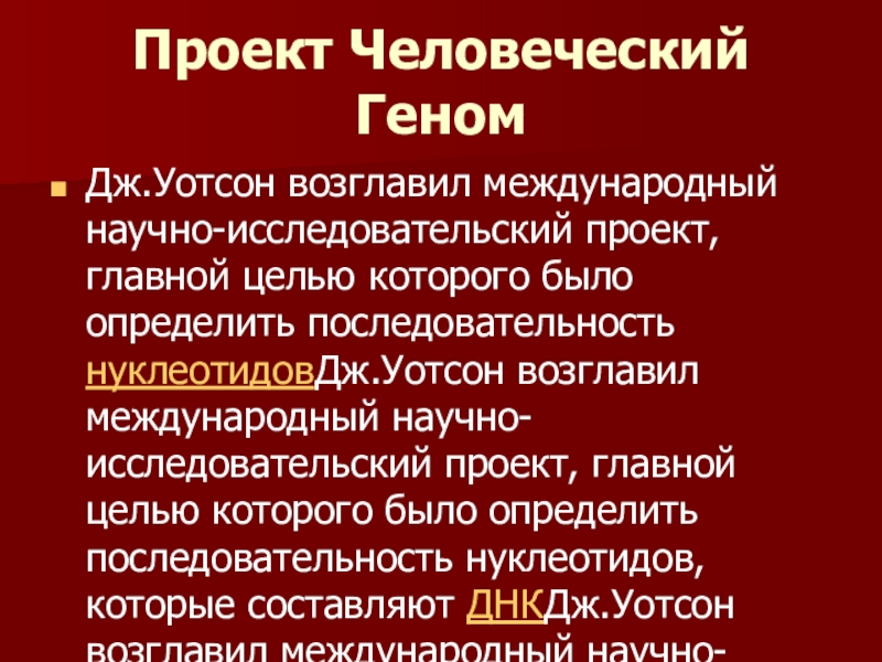 Проект Человеческий ГеномДж.Уотсон возглавил международный научно-исследовательский проект, главной целью которого было определить последовательность нуклеотидовДж.Уотсон возглавил международный научно-исследовательский