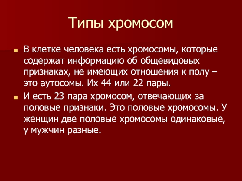Типы хромосомВ клетке человека есть хромосомы, которые содержат информацию об общевидовых признаках, не имеющих отношения к полу