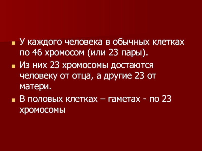 У каждого человека в обычных клетках по 46 хромосом (или 23