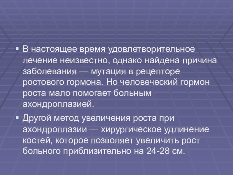 в рецепторе ростового гормона. Но человеческий гормон роста мало помогает больным ахондроплазией.