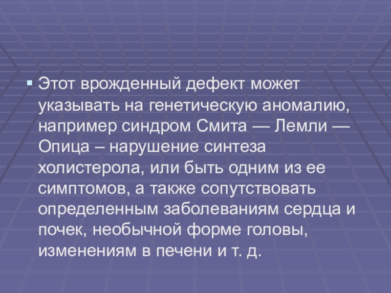 — Лемли — Опица – нарушение синтеза холистерола, или быть одним из ее симптомов, а также сопутствовать определенным заболеваниям сердца и почек, необычной форме головы, изменениям в печени и т. д.