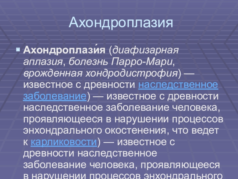 заболевание) — известное с древности наследственное заболевание человека, проявляющееся в нарушении процессов энхондрального окостенения, что ведет к карликовости) — известное с древности наследственное заболевание человека, проявляющееся в нарушении процессов энхондрального окостенения, что ведет к карликовости за счет недоразвития длинных костейНаследуется по аутосомно-доминантному типу.