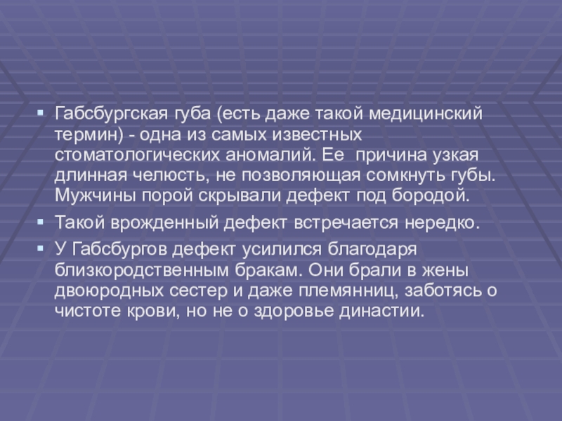 У Габсбургов дефект усилился благодаря близкородственным бракам. Они брали в жены двоюродных сестер и даже племянниц, заботясь о чистоте крови, но не о здоровье династии.