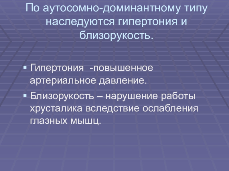 Слайд 13По аутосомно-доминантному типу наследуются гипертония и близорукость.