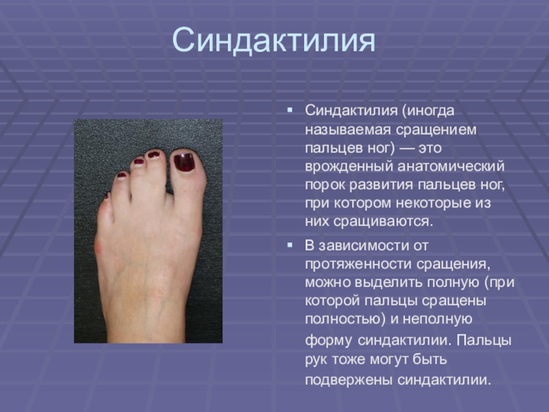 Синдактилия (иногда называемая сращением пальцев ног) — это врожденный анатомический порок