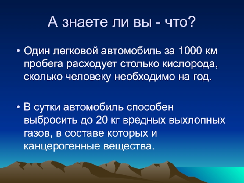 В сутки автомобиль способен выбросить до 20 кг вредных выхлопных газов, в составе которых и канцерогенные вещества.