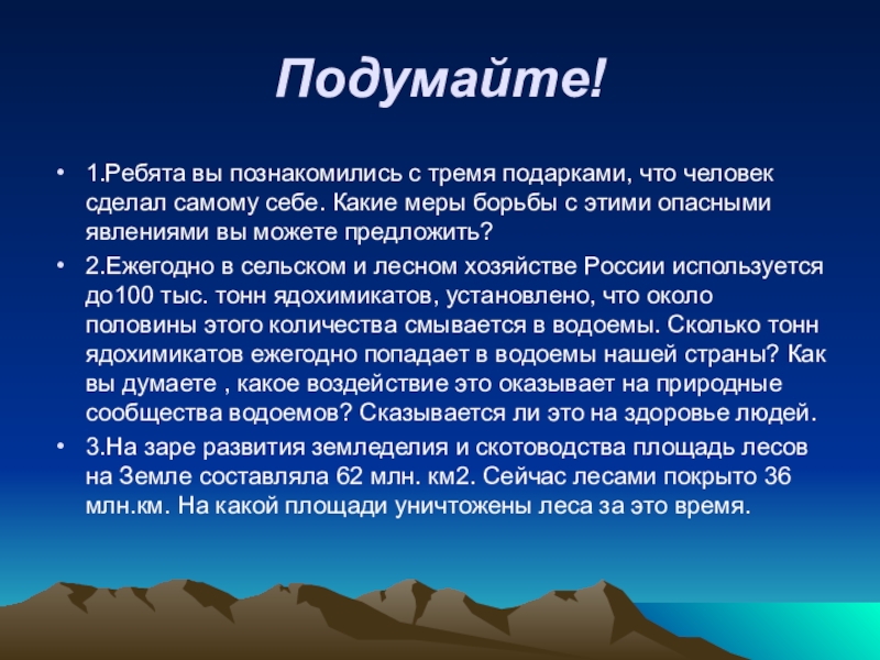 Слайд 14Три «подарка» человека самому себе и своей планете
