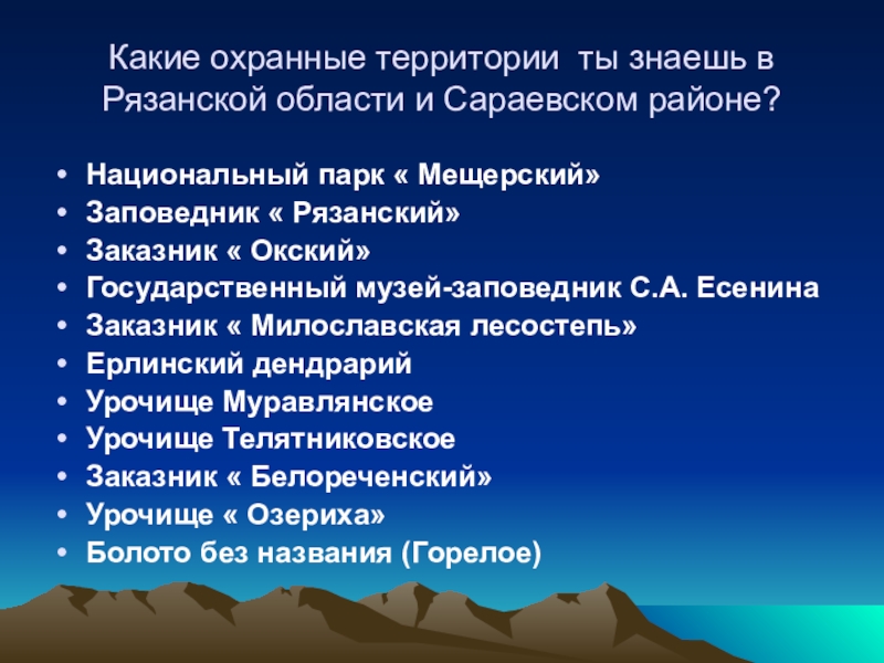 Слайд 33Какие охранные территории ты знаешь в Рязанской области и Сараевском районе?
