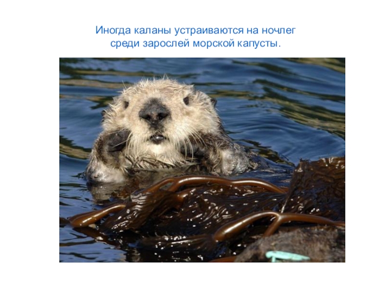 Слайд 7Иногда каланы устраиваются на ночлег среди зарослей морской капусты.