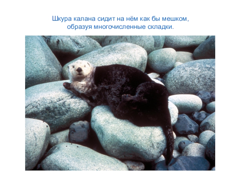 Слайд 6Шкура калана сидит на нём как бы мешком, образуя многочисленные складки.