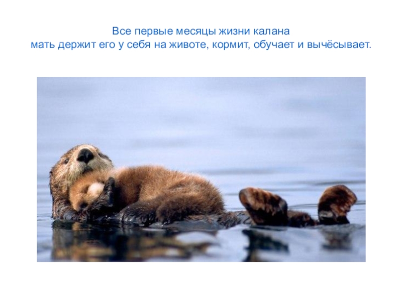 Слайд 10Все первые месяцы жизни калана мать держит его у себя на