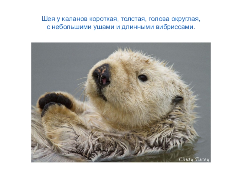 Слайд 5Шея у каланов короткая, толстая, голова округлая, с небольшими ушами и