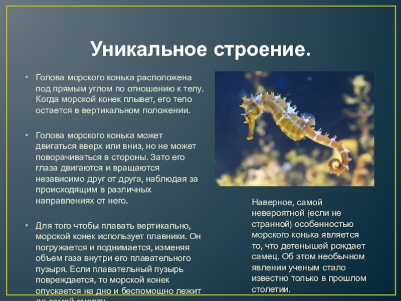 Наверное, самой невероятной (если не странной) особенностью морского конька является то, что детенышей рождает самец. Об этом необычном явлении ученым стало известно только в прошлом столетии.