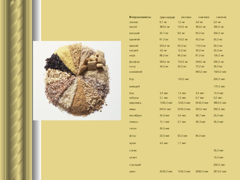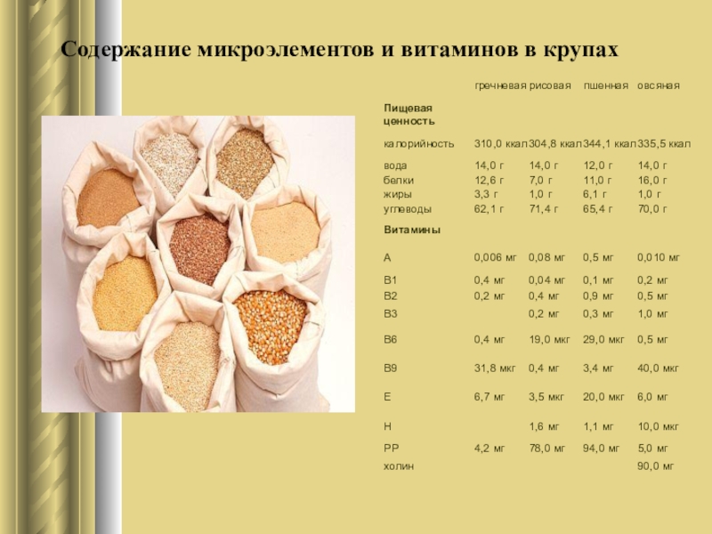 Слайд 27 Содержание микроэлементов и витаминов в крупах