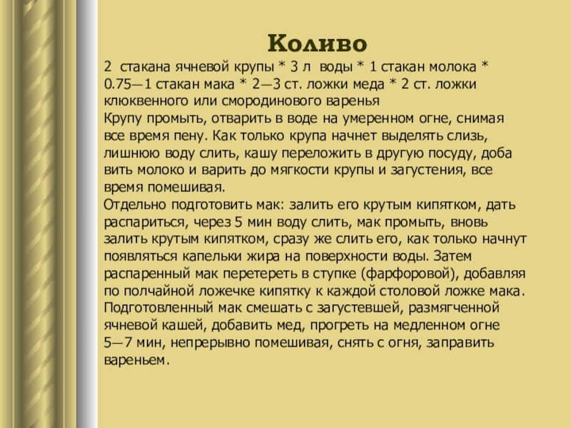 стакана ячневой крупы * 3 л воды * 1 стакан молока * 0.75—1 стакан мака * 2—3 ст. ложки меда * 2 ст. ложки клюквенного или смородинового варенья
