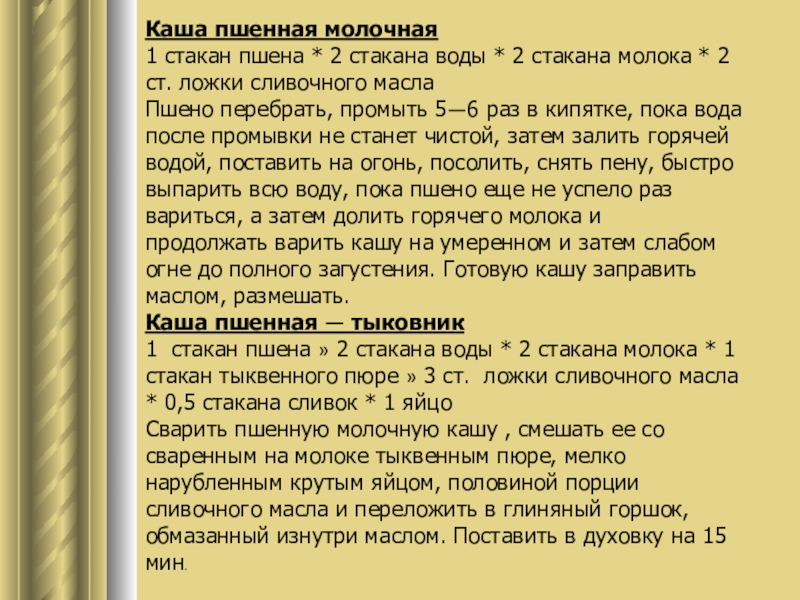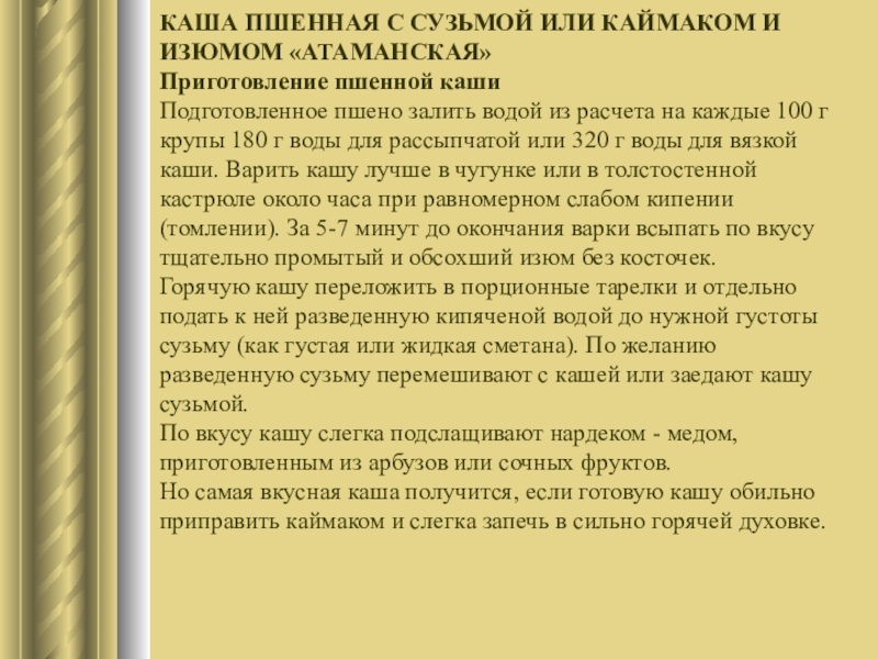 Слайд 26КАША ПШЕННАЯ С СУЗЬМОЙ ИЛИ КАЙМАКОМ И ИЗЮМОМ «АТАМАНСКАЯ»