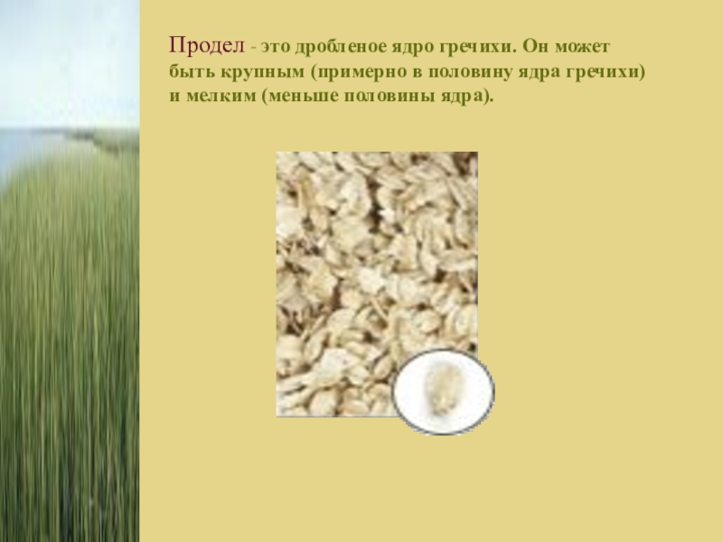 Слайд 22Продел - это дробленое ядро гречихи. Он может быть крупным (примерно