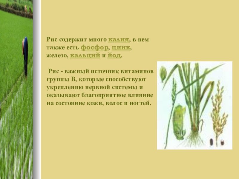Слайд 9Рис содержит много калия, в нем также есть фосфор, цинк, железо,