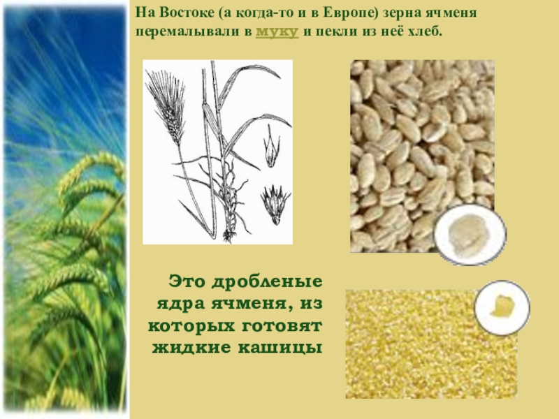 Слайд 12На Востоке (а когда-то и в Европе) зерна ячменя перемалывали в