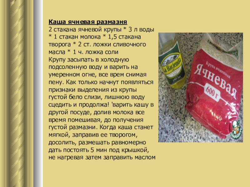 Крупу засыпать в холодную подсоленную воду и варить на умеренном огне, все врем снимая пену. Как только начнут появляться признаки выделения из крупы густой бело слизи, лишнюю воду сцедить и продолжа! 'варить кашу в другой посуде, долив молока все время помешивая, до получения густой размазни. Когда каша станет мягкой, заправив ее творогом, досолить, размешать равномерно дать постоять 5 мин под крышкой, не нагревая затем заправить маслом