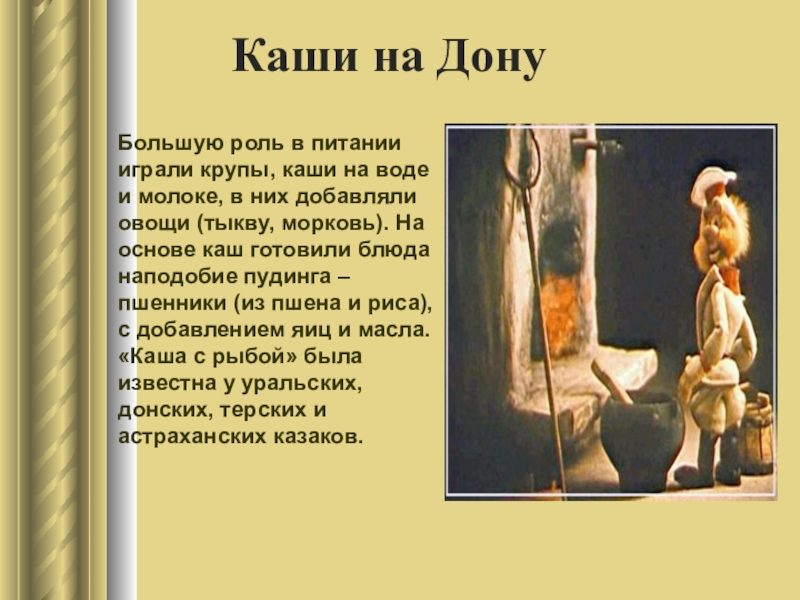 роль в питании играли крупы, каши на воде и молоке, в них добавляли овощи (тыкву, морковь). На основе каш готовили блюда наподобие пудинга – пшенники (из пшена и риса), с добавлением яиц и масла. «Каша с рыбой» была известна у уральских, донских, терских и астраханских казаков.