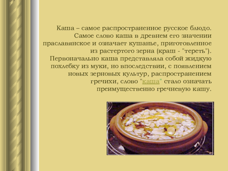 Слайд 3Каша – самое распространенное русское блюдо. Самое слово каша в древнем