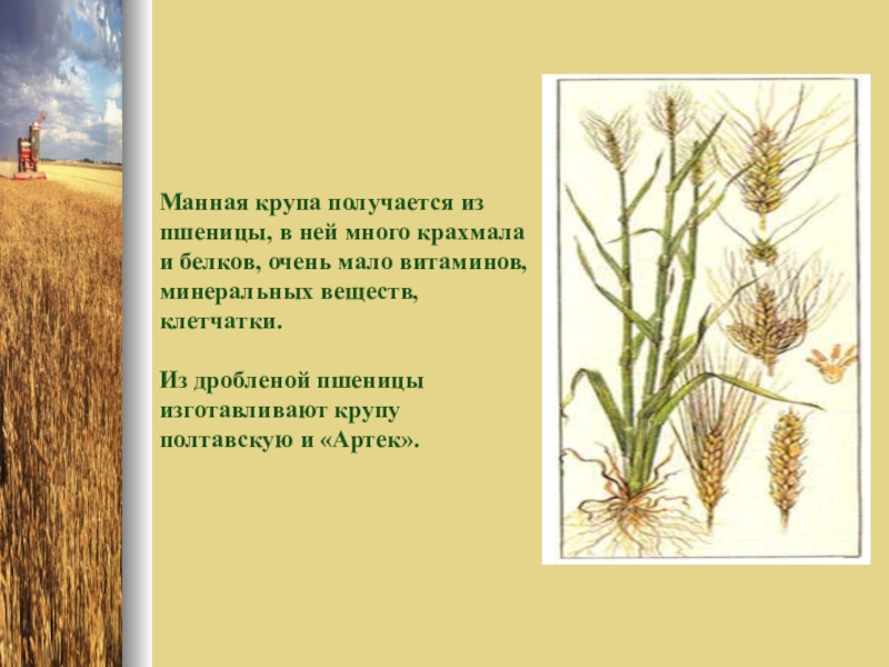 Слайд 7Манная крупа получается из пшеницы, в ней много крахмала и белков,