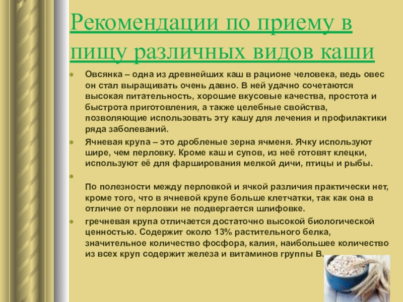 Слайд 29Рекомендации по приему в пищу различных видов каши