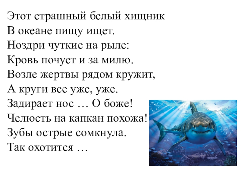 Этот страшный белый хищникВ океане пищу ищет.  Ноздри чуткие на рыле:  Кровь почует и за милю.  Возле жертвы рядом кружит,  А круги все уже, уже.  Задирает нос … О боже!  Челюсть на капкан похожа!  Зубы острые