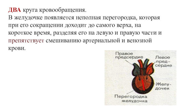 ДВА круга кровообращения.В желудочке появляется неполная перегородка, которая при его сокращении доходит до самого верха, на короткое