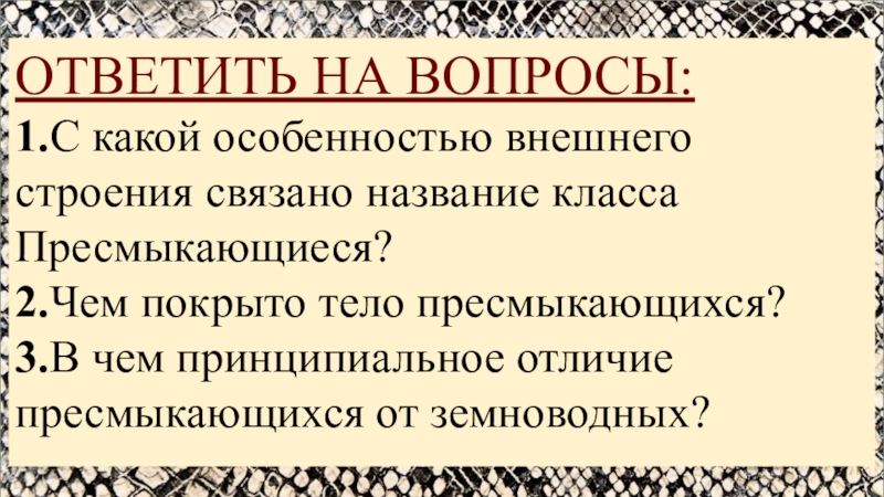 ОТВЕТИТЬ НА ВОПРОСЫ:1.С какой особенностью внешнего строения связано название класса Пресмыкающиеся?2.Чем покрыто тело пресмыкающихся?3.В чем принципиальное отличие