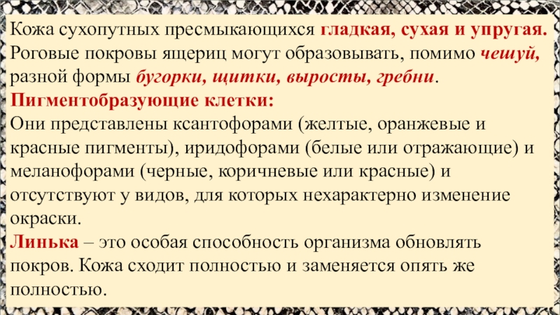 Слайд 14Кожа сухопутных пресмыкающихся гладкая, сухая и упругая. Роговые покровы ящериц могут