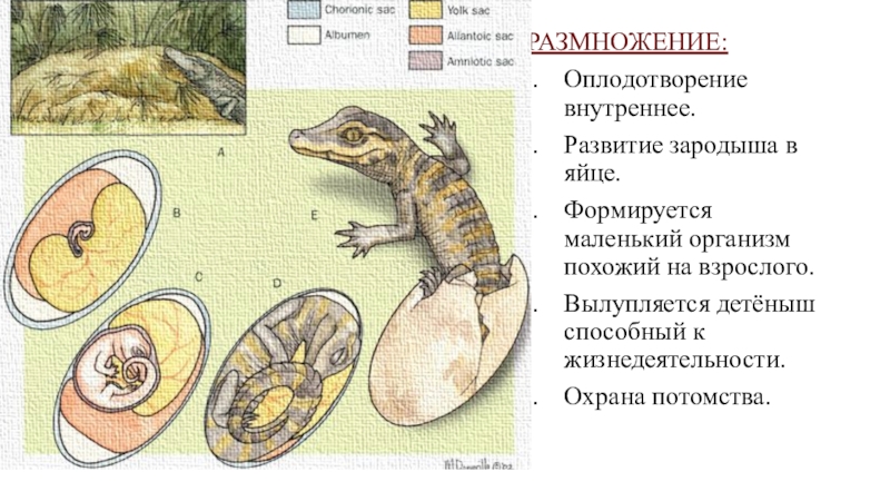 РАЗМНОЖЕНИЕ:Оплодотворение внутреннее.Развитие зародыша в яйце.Формируется маленький организм похожий на взрослого.Вылупляется детёныш способный к жизнедеятельности.Охрана потомства.