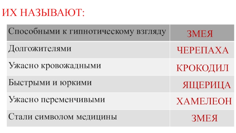 ИХ НАЗЫВАЮТ:ЗМЕЯЧЕРЕПАХАКРОКОДИЛЯЩЕРИЦАХАМЕЛЕОНЗМЕЯ