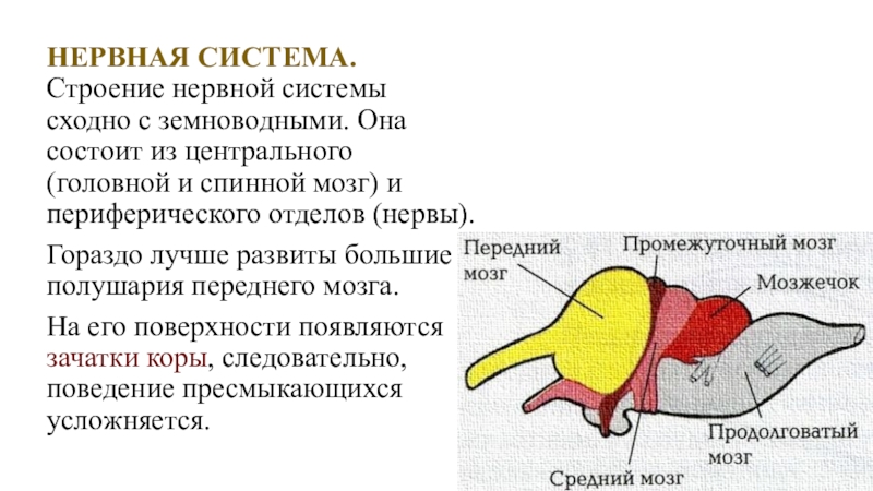 Слайд 18НЕРВНАЯ СИСТЕМА. Строение нервной системы сходно с земноводными. Она состоит из