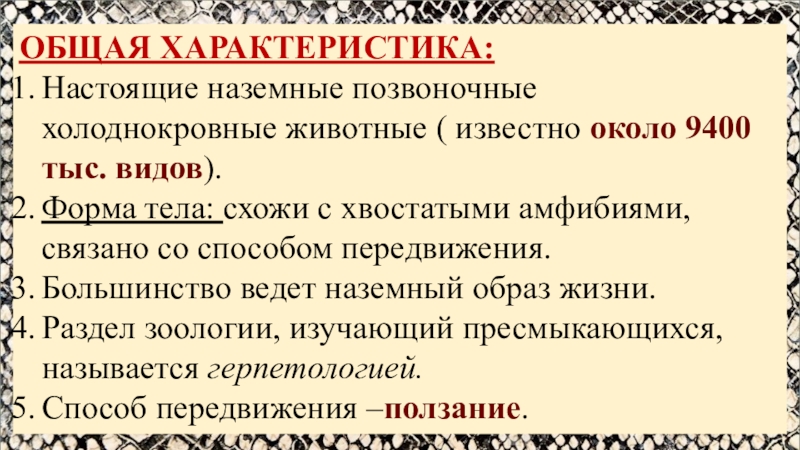 ОБЩАЯ ХАРАКТЕРИСТИКА:Настоящие наземные позвоночные холоднокровные животные ( известно около 9400 тыс. видов).Форма тела: схожи с хвостатыми амфибиями,