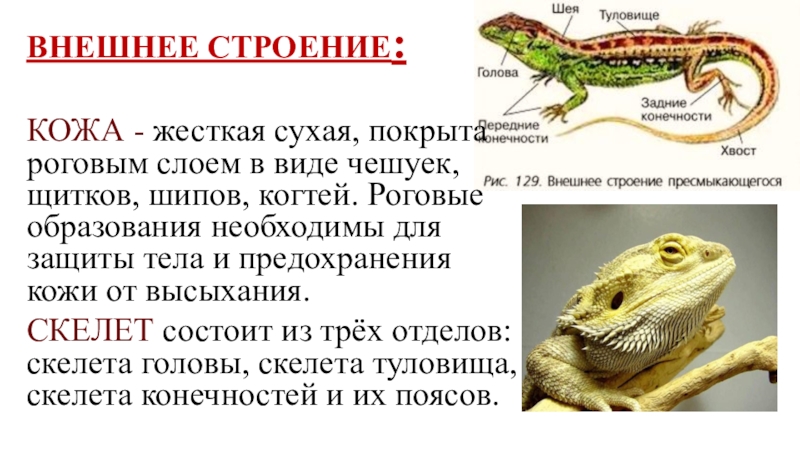 ВНЕШНЕЕ СТРОЕНИЕ: КОЖА - жесткая сухая, покрыта роговым слоем в виде чешуек, щитков, шипов, когтей. Роговые образования
