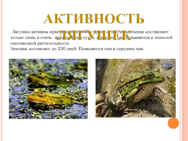 1.В определённые периоды года взрослые лягушки собираются для размножения в прудах, озёрах или ручьях. Многие лягушки возвращаются к тому водоёму, в котором они развивались головастиками. В итоге можно наблюдать сезонные миграции, в которые вовлечены тысячи особей. Самцы всегда первыми прибывают в места размножения и находятся там долгое время. Самок призывают кваканьем, а также защищают свою территорию от других самцов. Самки появляются позже лишь на время спаривания и икрометания. В такой ситуации количество самцов всегда больше самок, поэтому возникает жёсткая конкуренция.