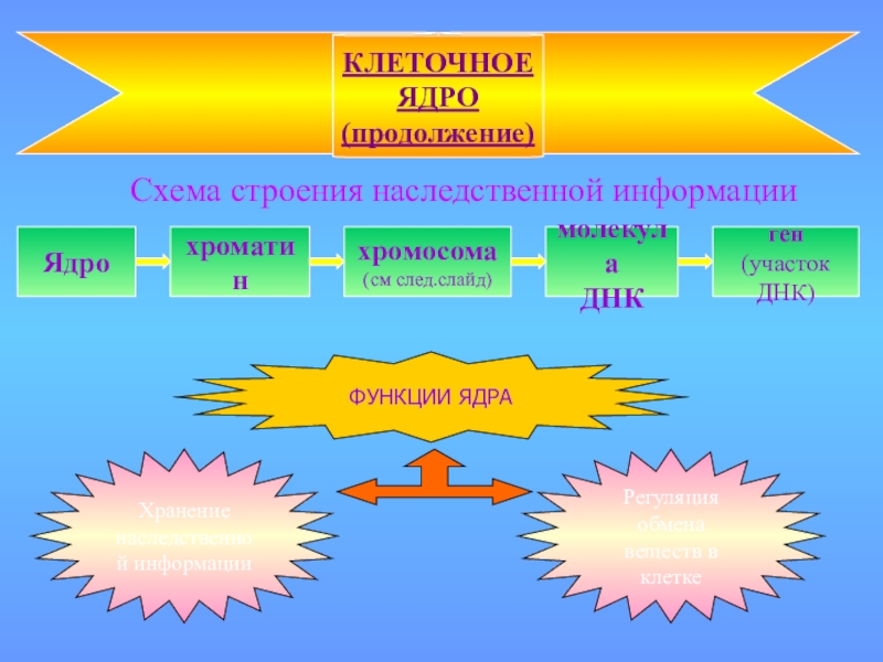 Схема строения наследственной информацииКЛЕТОЧНОЕ ЯДРО (продолжение)Ядрохроматинхромосома(см след.слайд)молекулаДНКген (участокДНК)