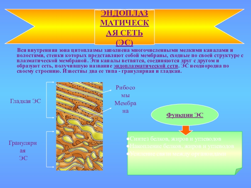 каналами и полостями, стенки которых представляют собой мембраны, сходные по своей структуре с плазматической мембраной. Эти каналы ветвятся, соединяются друг с другом и образуют сеть, получившую название эндоплазматической сети. ЭС неоднородна по своему строению. Известны два ее типа - гранулярная и гладкая.