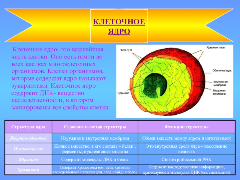 почти во всех клетках многоклеточных организмов. Клетки организмов, которые содержат ядро называют эукариотами. Клеточное ядро содержит ДНК- вещество наследственности, в котором зашифрованы все свойства клетки.