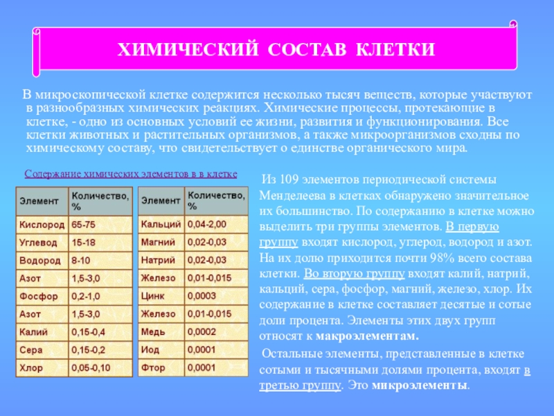 Содержание химических элементов в в клетке   В микроскопической клетке содержится несколько тысяч веществ, которые участвуют